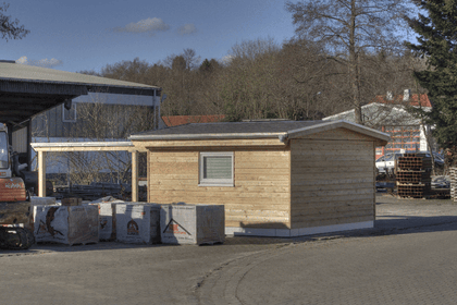 KVH-Träger, beplankt mit 25mm OSB-Platten und Stülpschalung aus sibirischer Lärche.